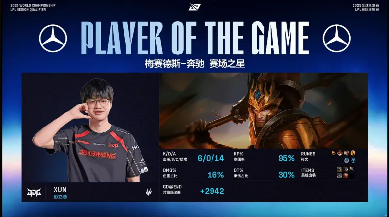 虎扑09月26日讯 在刚刚结束的JDG对阵WBG的BO5比赛中,Xun使用皇子打出6/0/14战绩,斩获JDG对阵WBG第一局MVP