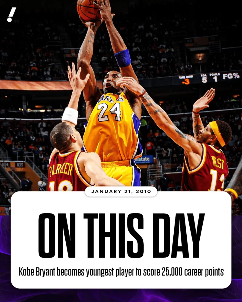 2010年1月21日,科比31岁151天拿到25000分,超越张伯伦(31岁186天)成为历史最年轻25000分先生。